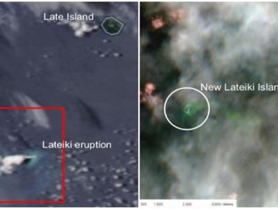 卫星图显示原先的拉德基岛(左图红方框)在火山爆发后沉没,其后形成一个更大的新岛...