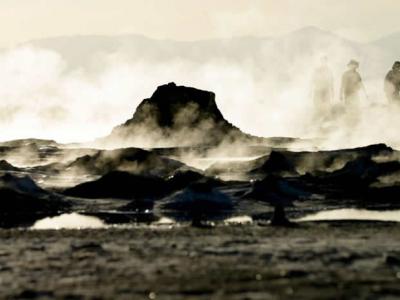 2015年,蒸气从加州沙尔顿湖岸附近的地热泥温泉里升起。 PHOT...