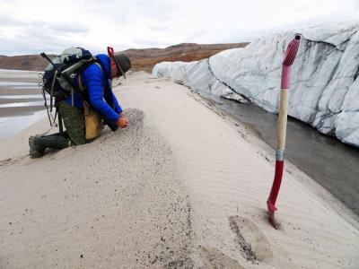 Kurt Kjær在海瓦萨冰川前沿收集沙石样本。该沙石被冰川...