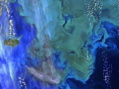 美国宇航局地球资源8号卫星拍摄到阿拉斯加州海域出现巨大的珍珠绿和蓝漆色“漩涡...