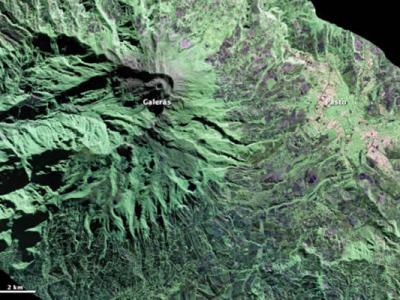 卫星照片展示哥伦比亚加勒拉斯火山的景象
