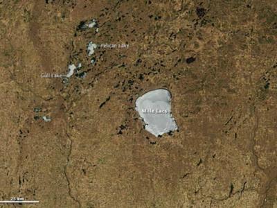 卫星照片展示美国明尼苏达五月的残留湖冰