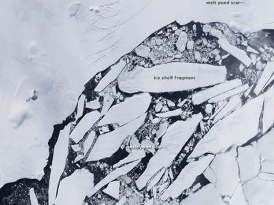卫星照片展示南极威尔金斯冰架的裂冰景象
