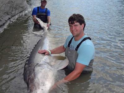 美国一对父子在河中捕获800斤大白鲟鱼后