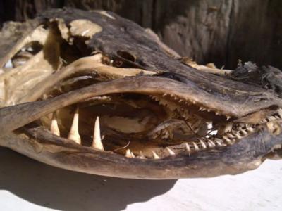 一位农夫在牛津郡查韦尔河的灌木丛中发现一个巨大的梭子鱼头骨,推测这是一条生长...
