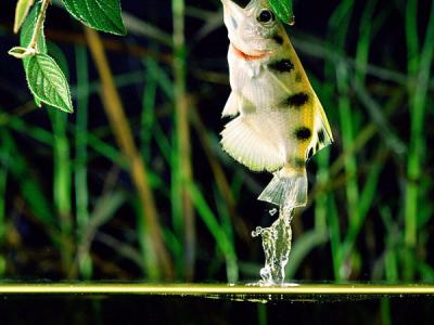 一只射水鱼朝水面上的猎物喷射水柱 射水鱼可以喷射出高达12英尺(约合3.6576米...