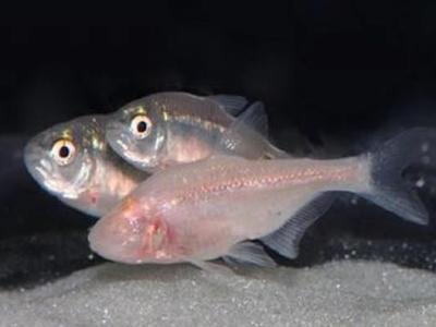越南洞穴淡水中发现的神秘新鱼类,图为新发现的鱼类和其他鱼同游情景,可以非常明...