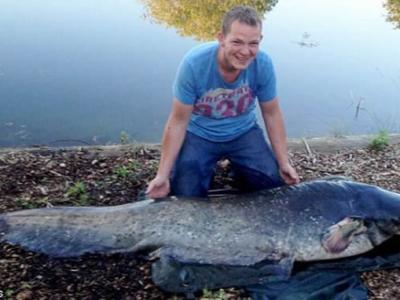 31岁厨师詹姆斯•琼斯奇迹般捕获一条巨型淡水鱼 这条鱼是一条六须鲶鱼,...