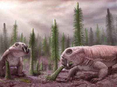 在二叠纪末大灭绝幸存下来的水龙兽复原图 Jessica Whiteside在野外采集化石 ...