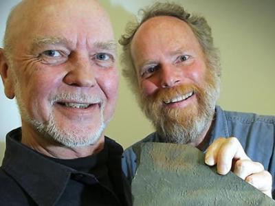 Martin Laan(左)、Clive Calver(右)和它们发现的古老化石 Martin Laan是塔斯...
