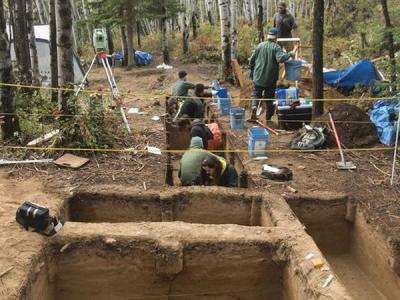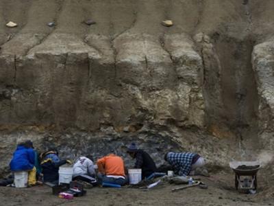 考古学研究小组在阿拉斯加遗址进行发掘工作,在这里他们发现了冰河世纪时期儿童遗...