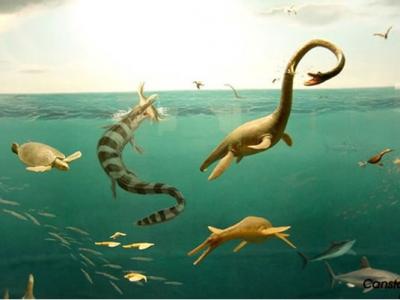 加拿大白垩纪海生动物复原图 沧龙(Mosasaur)化石 加拿大化石发现中心(Can...