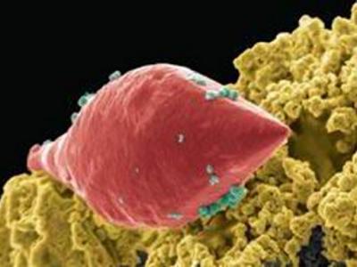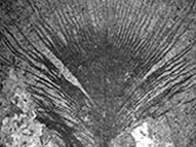 扫描电子显微镜显示了一个来源于不知名生物的大磁性化石,在它周围包围着来源于细...