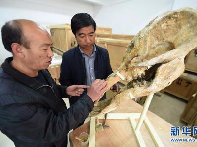4月28日,在甘肃和政古动物化石博物馆修复室,修复...