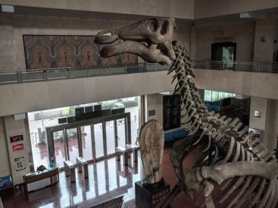 天宇自然博物馆入口处的恐龙骨骼化石。根据吉尼斯世界纪录,该博物馆是世上最大的...