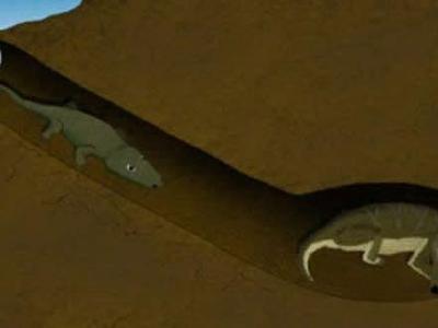 艺术家复原2.5亿年前两种不同种类物种如何共栖一个洞穴 科学家在南非卡鲁盆地挖...
