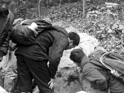 学生们在观察化石 栖霞山的红叶好看,吸引了游人前来参观。山上的石头,则藏有“...
