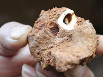 一块哺乳动物头骨化石,牙齿窝里的沉积物,原来是史前蜜蜂筑的巢穴。图片来源:uux...