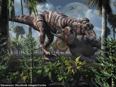 一幅模拟图,展示了霸王龙猎捕三角龙的景象。科学家的电脑模型对研究中涉及的所有...