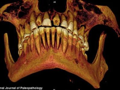 研究人员通过CT扫描图片观察木乃伊的口腔,并重建了一张显示磨损门牙的3D图。 ...