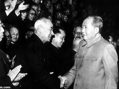 1964年12月全国政协四届一次会议上毛泽东与李四光握手。 (采自《李四光画传》/图...