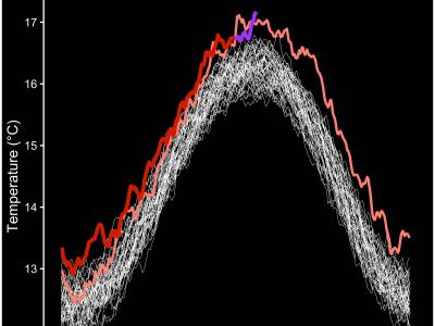 1980-2022年MERRA-2的每日全球平均温度值以白色显示,2023年的值以粉红色显示,202...