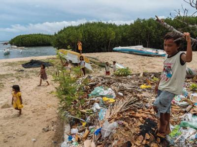孩童在菲律宾保和岛的一个垃圾堆旁边玩耍。在大潮或下雨的时候...