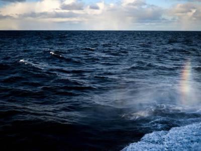 国际空间站望向大西洋的景色。阳光洒在水面上,把照片中央的水染成了黄橙色。海面上...