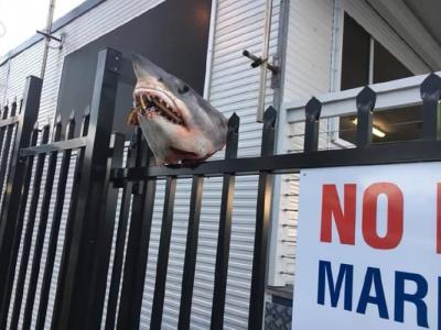 组织门外的铁栏插着鲨鱼头。米切尔相信鲨鱼头来自尖吻鲭鲨。(...