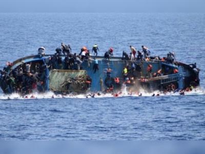 去年全球的难民人数创下新纪录,图为一艘翻侧的难民船。(神秘...