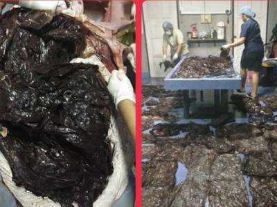 短肢领航鲸搁浅泰国的塔普潜湾海边,尸体肚子里面有80几个塑胶...