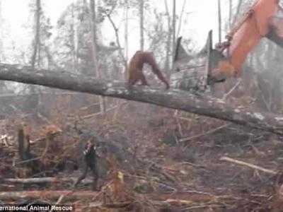 国际动物救援组织:印尼雨林红毛猩猩为保卫家园冲向挖土机却跌...