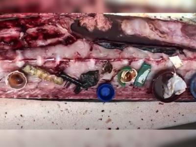塑料垃圾为患海洋 剖开鱼肚捞出一堆