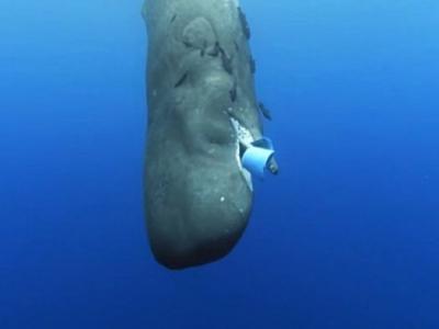 抹香鲸被拍到试图吃下一个蓝色胶水桶。胶片堵塞在抹香鲸的口部...