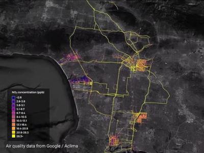 测量指数中,蓝色代表二氧化氮偏低,而黄色则是偏高...