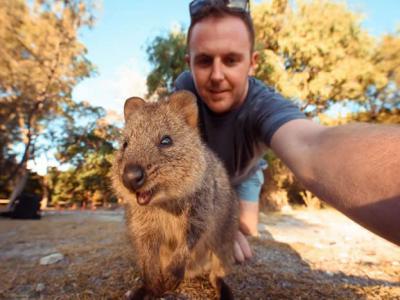 一名男子在澳洲伯斯与一只短尾矮袋鼠自拍。 PHOTOG...