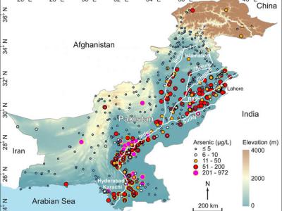 在巴基斯坦地下水中测得的砷浓度。在印度河的广大地...