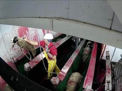 屠宰员将羊监生割喉后,再把它们丢到输送带。羊儿被...