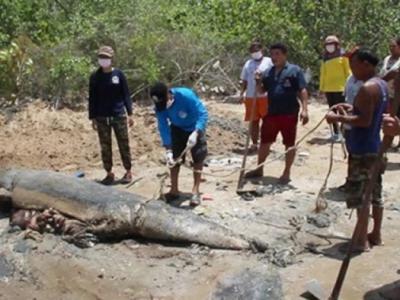 当地民众协力处理鲸鱼尸体。当局不排除鲸鱼死因与海...
