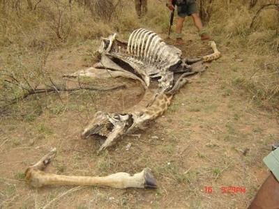 长颈鹿曝尸草原,全身只有尾巴不见了。 武装的工作人员循着秃鹫的踪迹找到长颈...