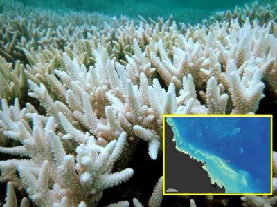 专家指大堡礁珊瑚白化情况极严重。小图显示白化的珊瑚带。 休斯预料大堡礁有一...