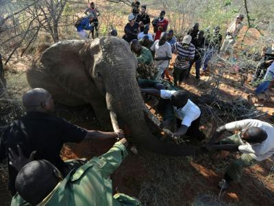 兽医队伍合力麻醉一只母象,并装上追踪器。 大象中枪后昏昏欲睡。 察沃国家...