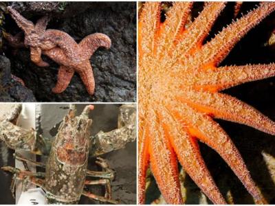 大批海星(左图上)及龙虾(左图下)死亡,科学家称与海水变暖有关。右图为正常海...