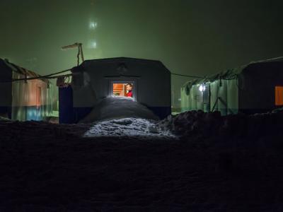 博瓦年科沃钻井队的一名成员在他和其他至多三名男性共用的拖车里休息。钻井工人大...
