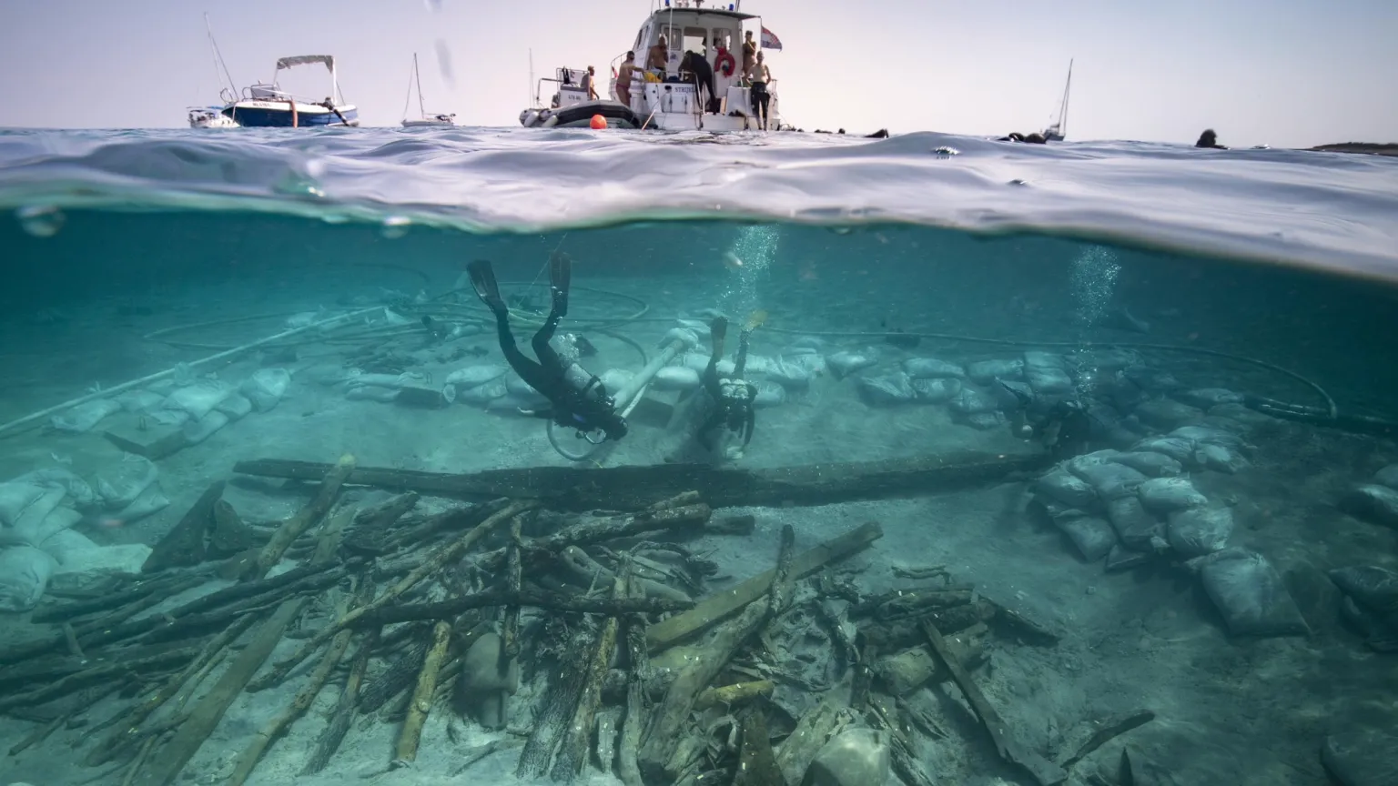 伊洛维克-帕尔津1号沉船船首区域发掘的景观。前景可见原木和双耳瓶的货物。考古学家...