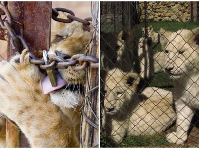 狮子和老虎被圈养作狩猎用 圈养场环境大多恶劣 狮子和老虎被困在同一狭小空...