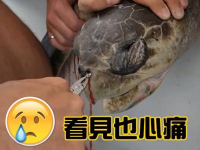 保育人员用钳子慢慢拔出卡在海龟鼻孔的饮管 保育人员拔出饮管时,海龟痛得挣扎...