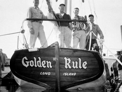 1958年3月25日,黄金定律号的船员在从加州启航到马绍尔群岛抗议核弹试爆之前,摆...