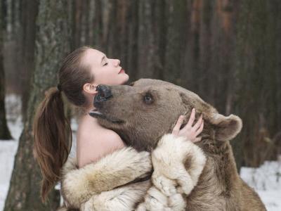 宣传反狩猎理念 俄罗斯650公斤棕熊与女模