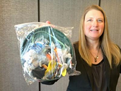詹贝克展示从佛州巴拿马海滩检获的塑胶垃圾 (神秘的地球报道)美国乔治亚大学一...